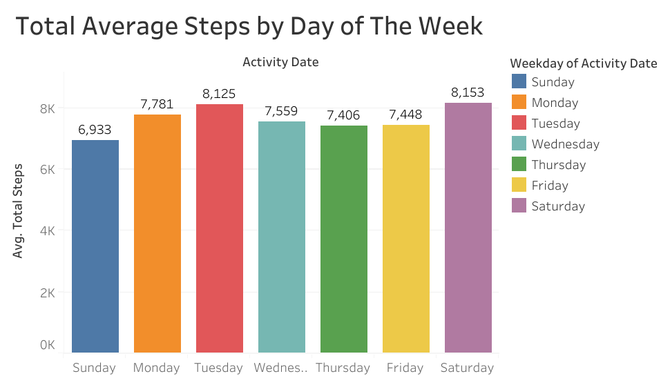 The data shows the average steps taken by day of the week. We can clearly see that the highest average steps taken took place on Saturdays followed closely by Tuesdays. Knowing when users are most active may confirm or dispel previously recorded data. For example, it may be reasonable to assume that users are most active on the weekend. Our data shows that though users are most active on Saturday’s they are almost as active during the week.